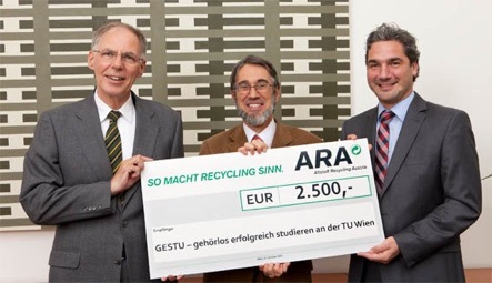 Die ARA hat den Betrag, der durch die Automatensammlung zusammengekommen ist, aufgestockt. „Wir unterstützen GESTU mit einem Gesamtbetrag von 2.500 Euro und freuen uns, damit einen Beitrag zum Erfolg dieses engagierten Projekts leisten zu können“, erklärt Erwin Janda, Projektverantwortlicher der ARA, anlässlich der Scheckübergabe an Prof. Wolfgang Zagler von GESTU am 25. Oktober 2012. „Für viele gehörlose Studierende ist momentan die Übersetzung durch Gebärdensprachdolmetscherinnen und -dolmetscher die einzig praktikable Lösung, um Vorlesungen folgen zu können. Durch Beihilfen werden aber nur die Dolmetschkosten für maximal eine Lehrveranstaltung pro Semester gedeckt. Im Modellversuch GESTU, aus dem sich ein österreichweites Konzept entwickeln soll, schließen wir mit Mitteln des Bundesministeriums für Wissenschaft und Forschung diese Lücke weitgehend. Für jede weitere finanzielle Unterstützung, um dieses Service auszubauen, sind wir immer dankbar", freut sich Zagler über die Spende der ARA.